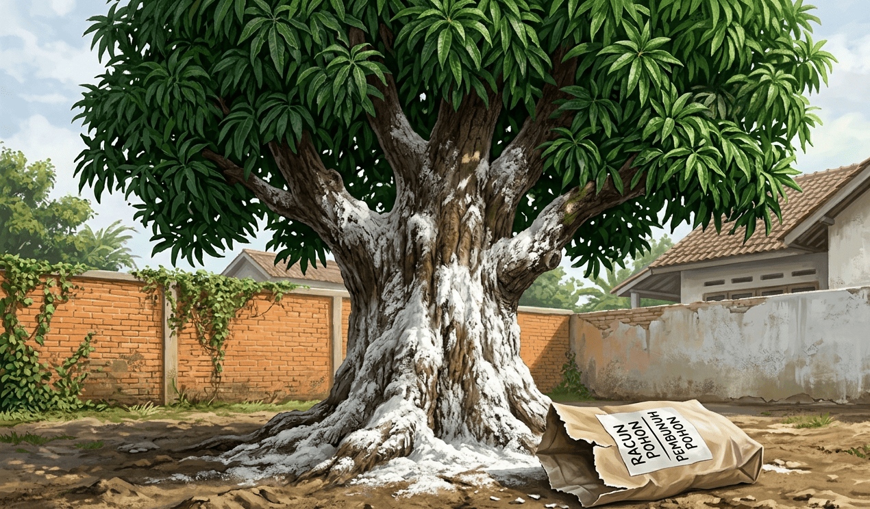 Akhirnya, saya inisiatif mencari cara buat membunuh pohon itu. Tujuannya agar pohon mati kering dan tidak membahayakan rumah.